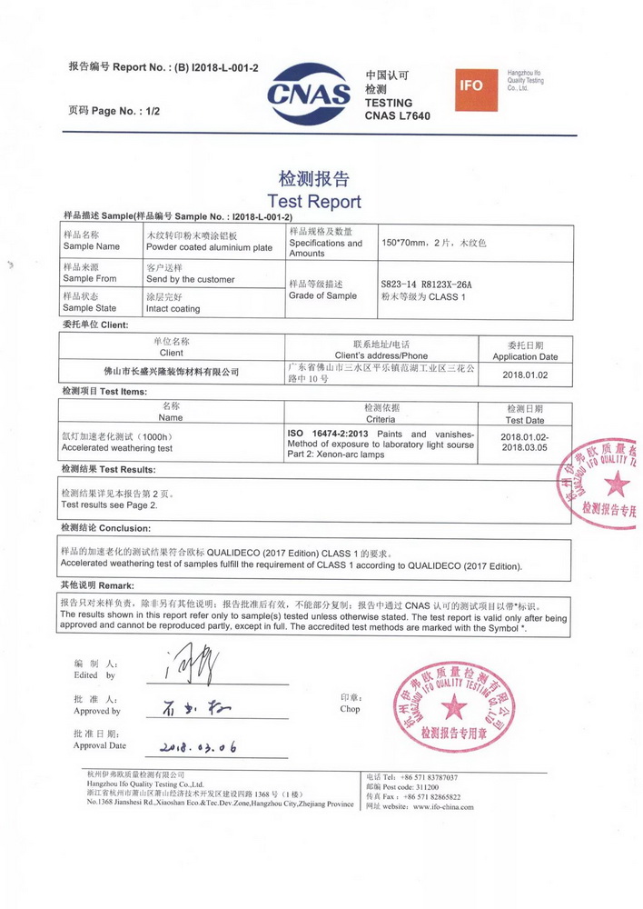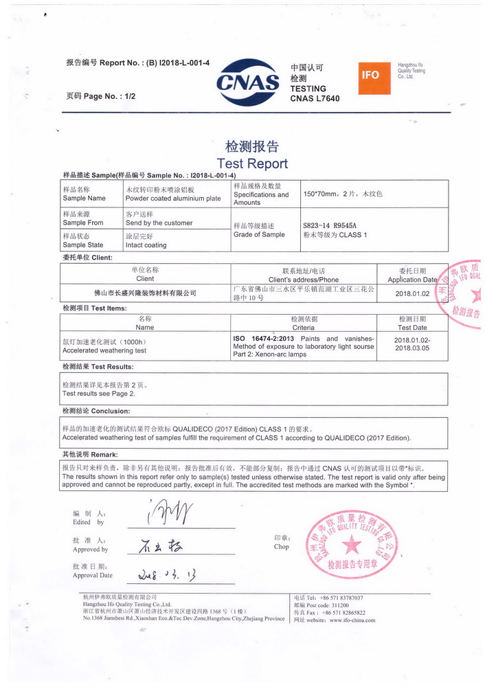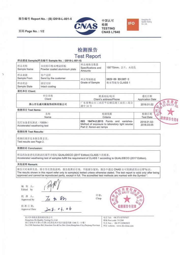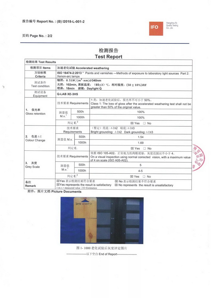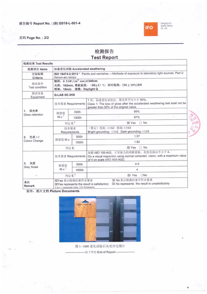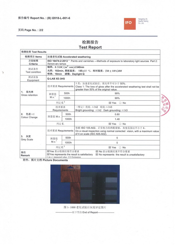2018年1月份,按照QUALIDECO 2017版檢測要求,將深、中、淺三個色系共六款產(chǎn)品送檢QUALIC0AT杭州伊弗歐質(zhì)量檢測有限公司,依據(jù)ISO 16474-2進(jìn)行1000小時氙燈耐老化檢測。權(quán)威機(jī)構(gòu)的檢測證明我司六款木紋產(chǎn)品在色差及保光率測試中完全達(dá)標(biāo)。成為通過QUALIDECO 2017版1000小時氙燈耐老化檢測木紋轉(zhuǎn)印紙、膜生產(chǎn)廠家,產(chǎn)品性能媲美意大利進(jìn)口產(chǎn)品