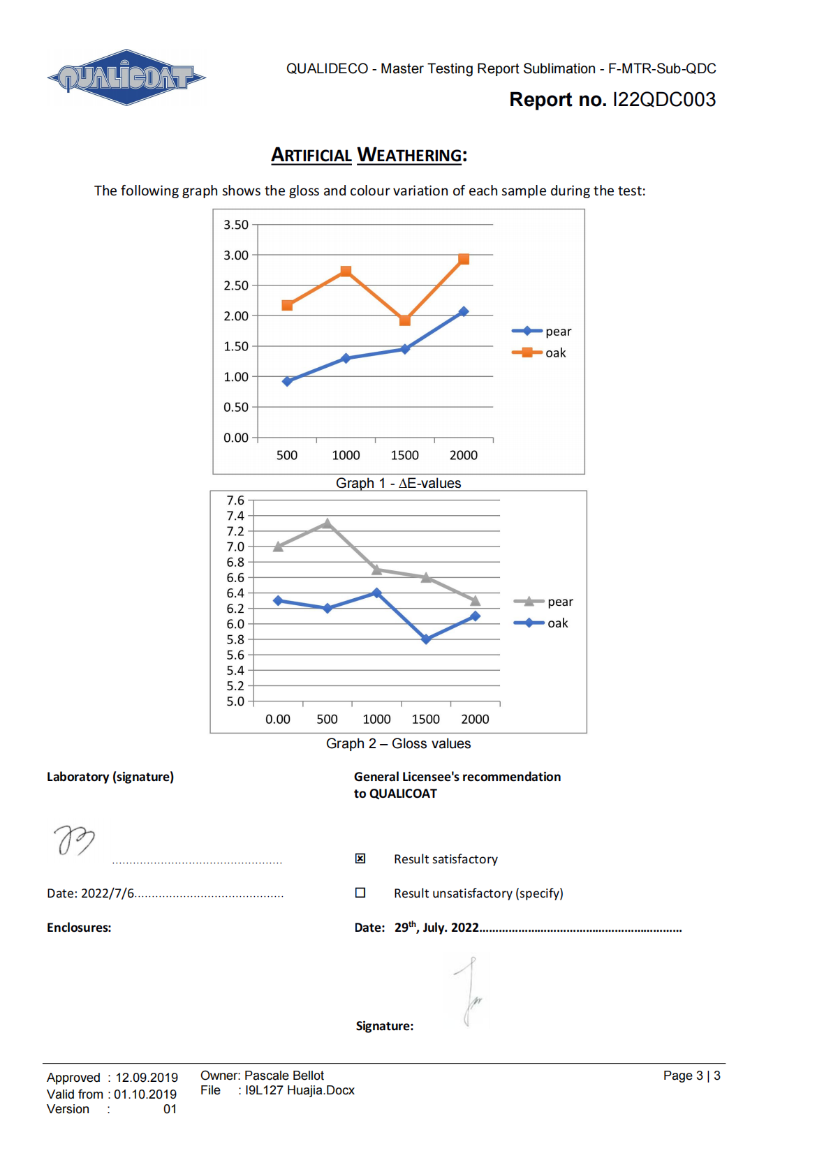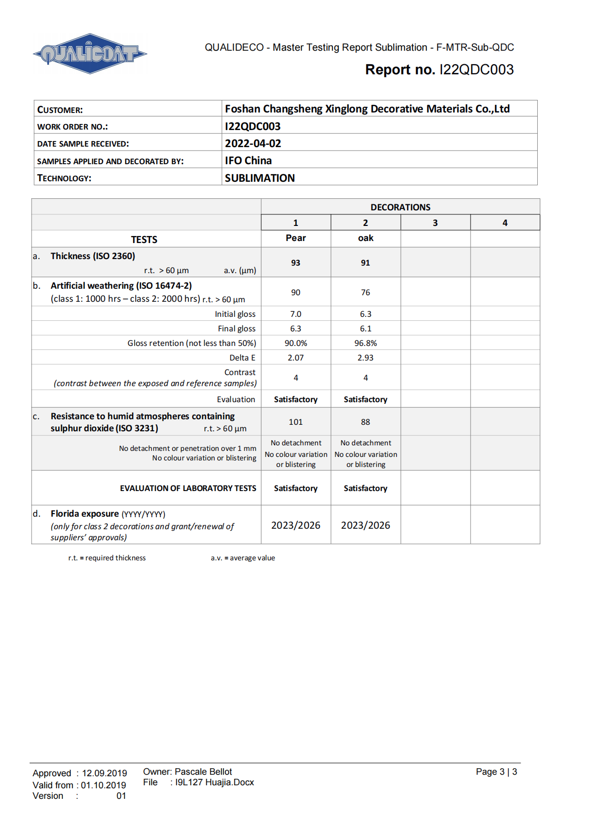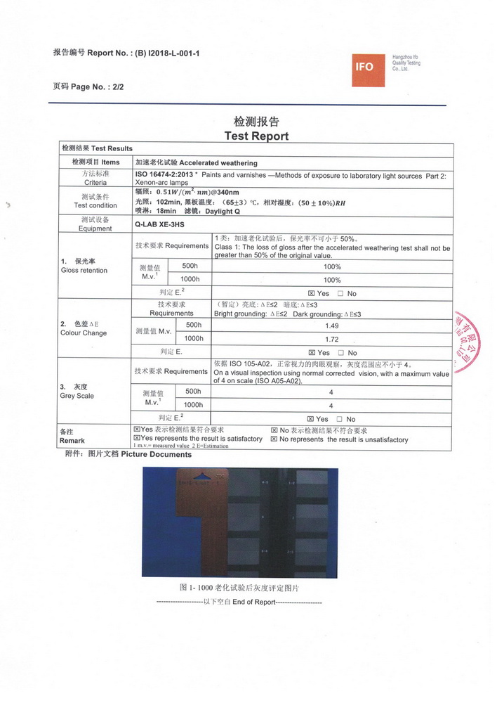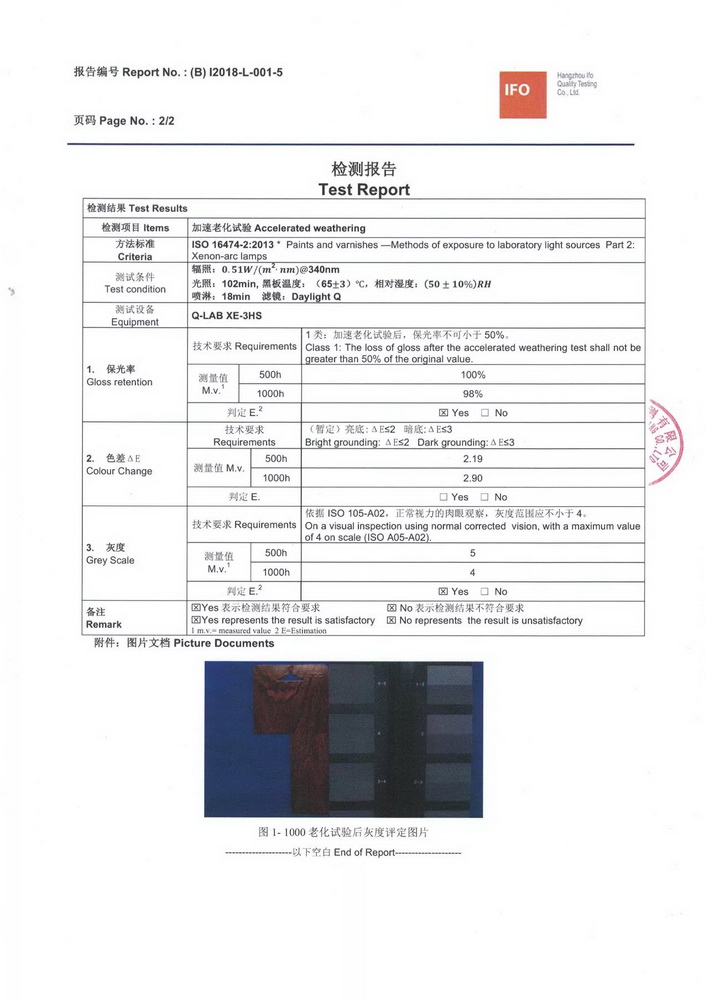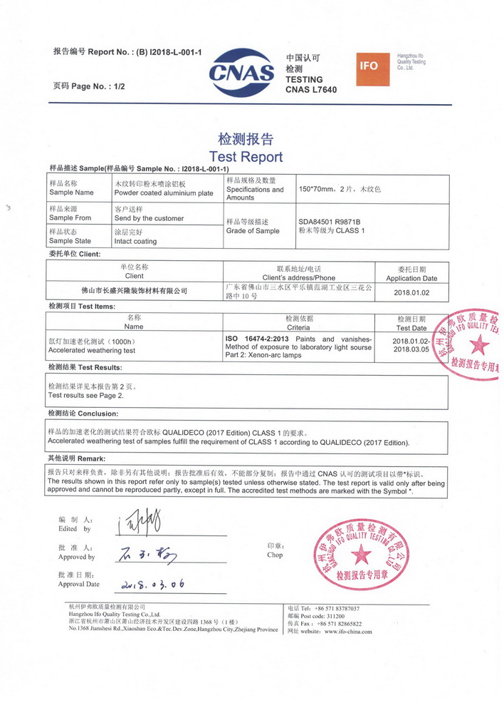 2018年1月份,按照QUALIDECO 2017版檢測要求,將深、中、淺三個色系共六款產(chǎn)品送檢QUALIC0AT杭州伊弗歐質(zhì)量檢測有限公司,依據(jù)ISO 16474-2進(jìn)行1000小時氙燈耐老化檢測。權(quán)威機(jī)構(gòu)的檢測證明我司六款木紋產(chǎn)品在色差及保光率測試中完全達(dá)標(biāo)。成為通過QUALIDECO 2017版1000小時氙燈耐老化檢測木紋轉(zhuǎn)印紙、膜生產(chǎn)廠家,產(chǎn)品性能媲美意大利進(jìn)口產(chǎn)品